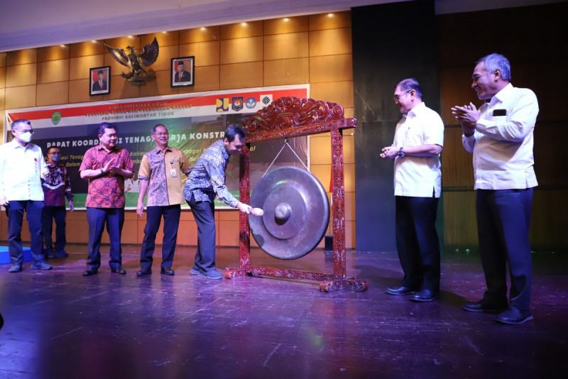Pembukaan kegiatan di Ballroom Hotel Bumi Senyiur ditandai dengan pemukulan gong, mengangkat tema “Partisipasi Tenaga Konstruksi Kalimantan Timur Sebagai Masyarakat Lokal Dalam Penyelenggaraan Pembangunan Ibu Kota Nusantara”.